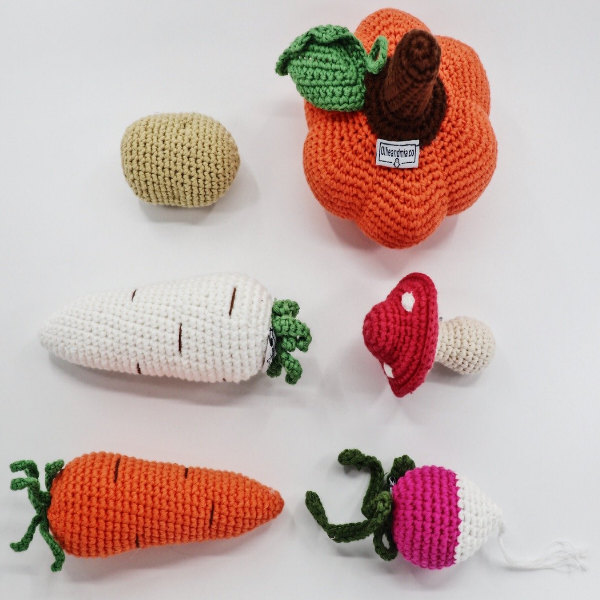 The vegetable set makes for a fun time in your child's kitchen play set. Help them learn what different types of vegetables look like so they can use them to play cook or grocery shop. Pretend play will encourage the development of your child’s imagination and also practise fine motor skills. These bright knitted vegetables set is the great gift for kids birthday or baby shower.